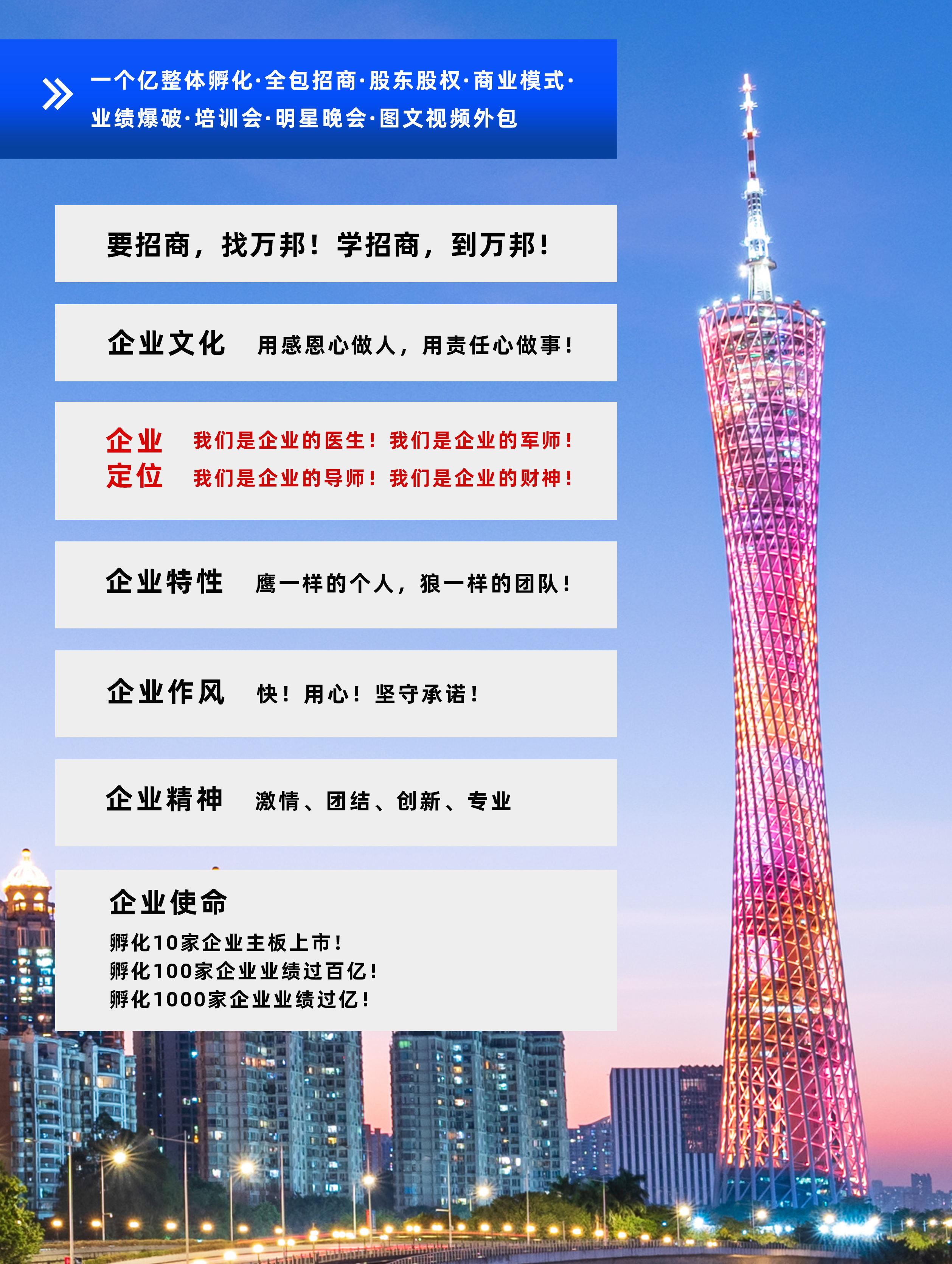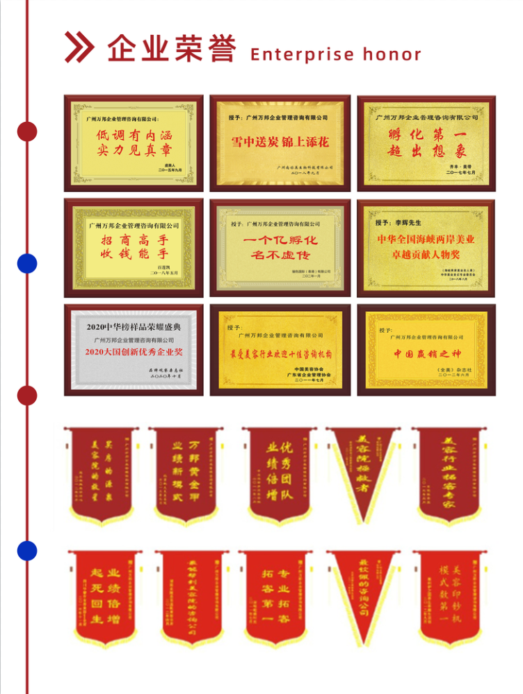 萬邦集團成立于2003年6月,專注于為企業進行招商和整體孵化,包含公司診斷、產品定位到量身打造商業模式系統,再到投人、投錢、投資源,一起干的分紅股東招募,鐵血軍團的打造,全國招商會議,為企業建立一套完善;成熟的招商系統,教育系統、培訓系統。